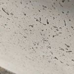As peças cimentícias são feitas de concreto de alta resistência, composto por cimento, pigmentos, aditivos e agregados selecionados. Por ser um material natural, ele apresenta variações únicas de cor e textura. As bolhas de ar, comuns no processo produtivo, surgem naturalmente durante a cura do material e não comprometem a qualidade, funcionalidade ou durabilidade da peça. Técnicas como o controle da velocidade de enchimento dos moldes e o uso de aditivos ajudam a reduzir essas bolhas, mas algumas permanecem, conferindo um aspecto singular ao produto. A superfície superior recebe acabamento para facilitar a limpeza, enquanto as laterais mantêm a textura natural, valorizando a estética autêntica do concreto.